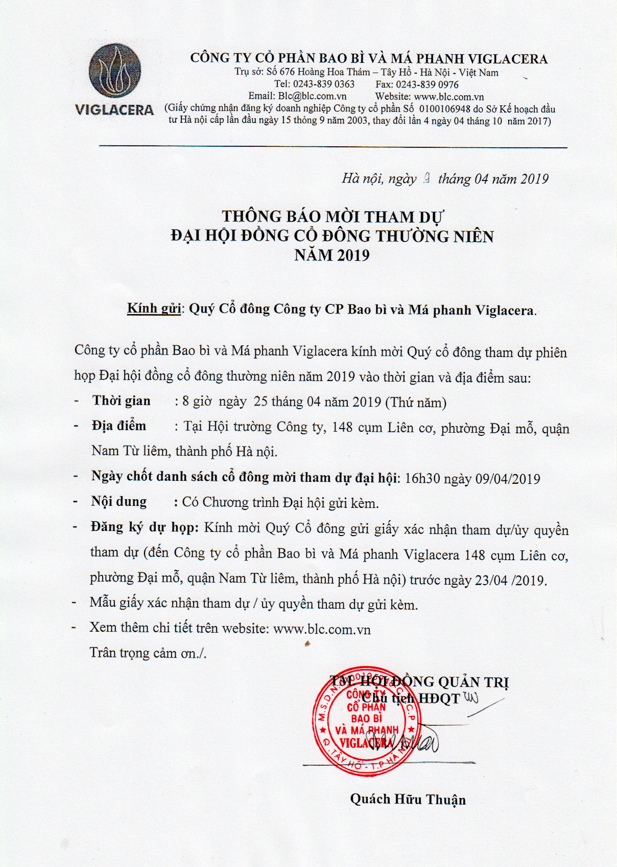 Ngày 25/04/2019 (Thứ năm), Công ty cổ phần Bao bì và Má phanh Viglacera tổ chức Đại hội cổ đông thường niên năm 2019 tại hội trường Công ty số 148 cụm Liên Cơ, phường Đại Mỗ, quận Nam Từ Liêm, TP Hà Nội