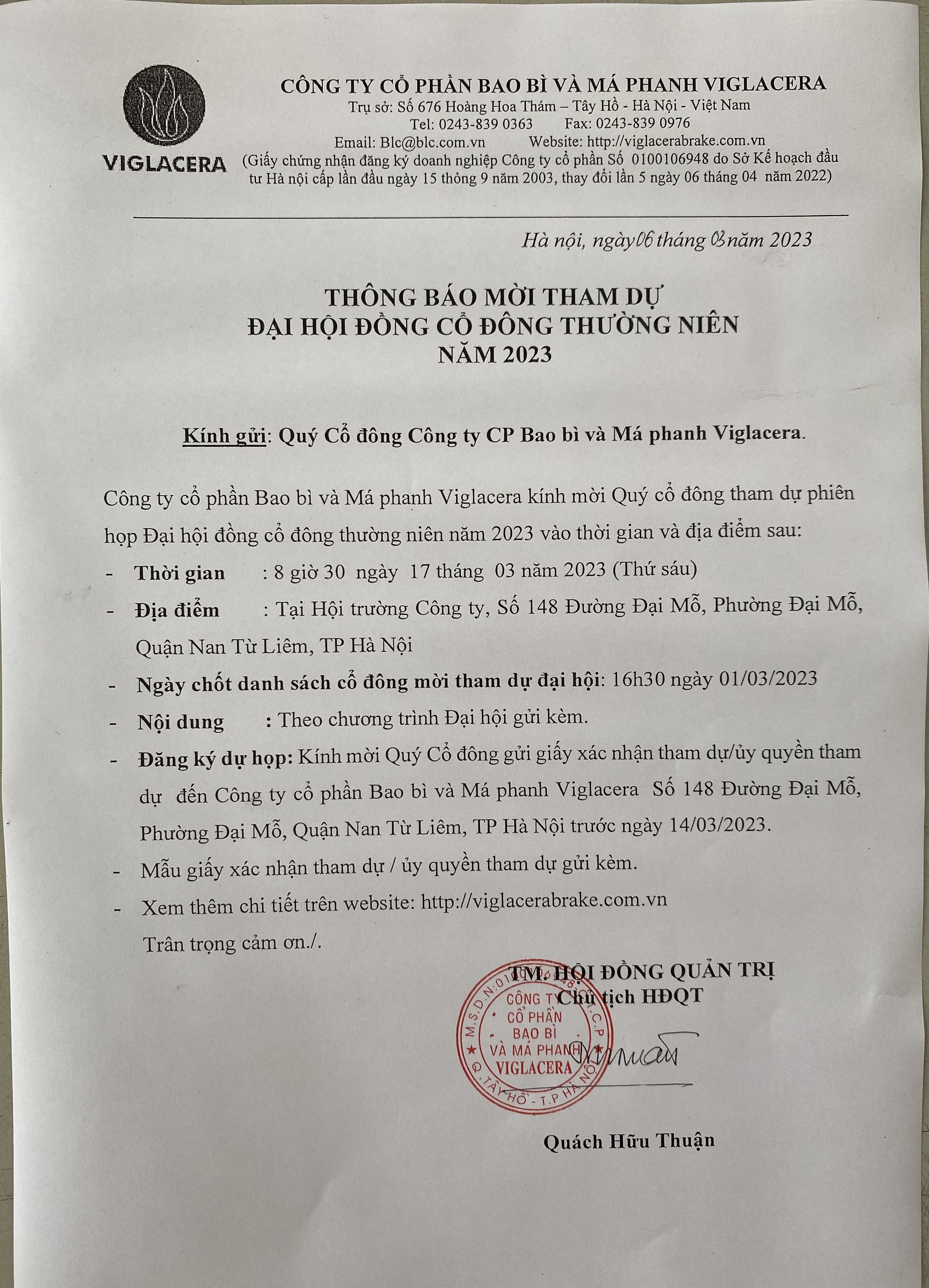 Vào lúc 8h30 ngày 17/03/2023 (Thứ sáu), Công ty cổ phần Bao bì và Má phanh Viglacera tổ chức Đại hội cổ đông thường niên năm 2023 tại Hội trường Công ty, số 148 Liên Cơ, Phường Đại Mỗ, Quận Nam Từ Liên, TP Hà Nội. Nội dung cụ thể như sau: