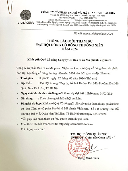 Công ty cổ phần Bao bì và Má phanh Viglacera kính mời Quý cổ đông tham dự phiên họp Đại hội cổ đông thường niên năm 2024 vào lúc 8h30 ngày 22/03/2023 (Thứ sáu) tại Hội trường Công ty, số 148 Liên Cơ, Phường Đại Mỗ, Quận Nam Từ Liên, TP Hà Nội. Nội dung cụ thể như sau: