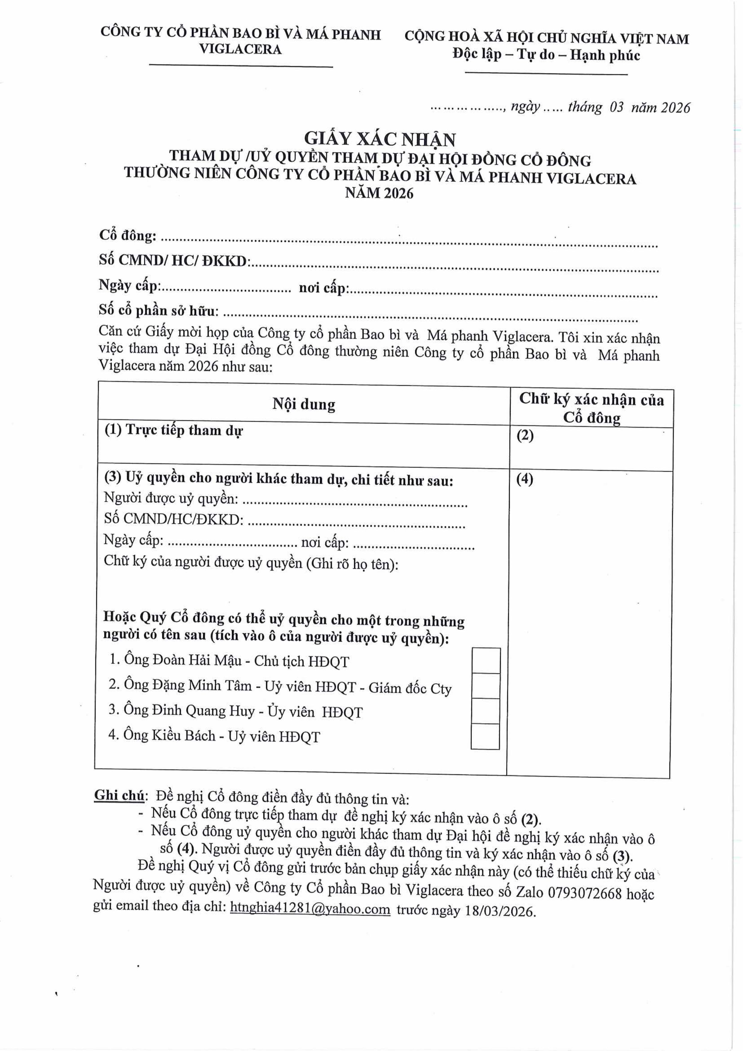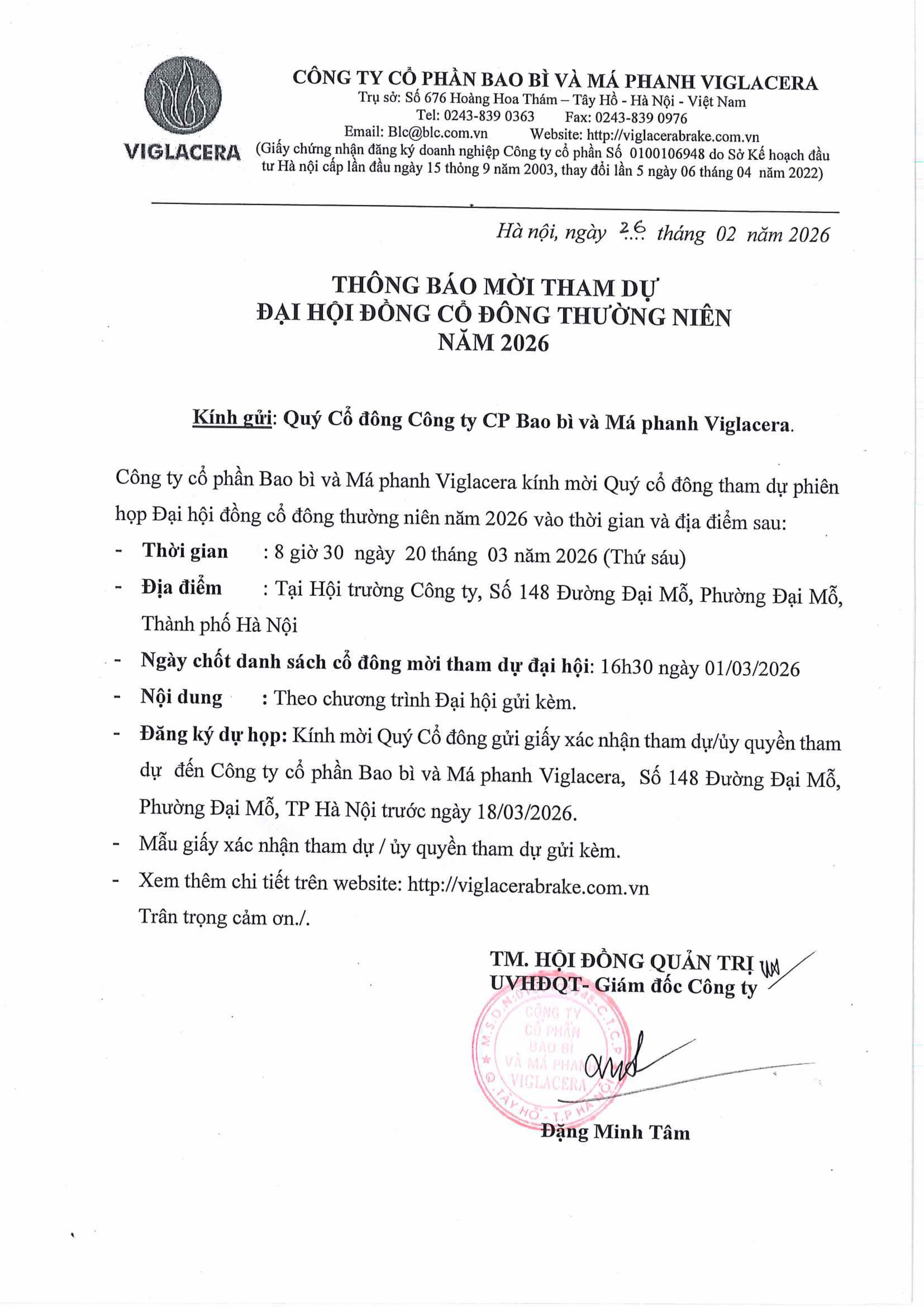 Vào lúc 8h30 ngày 20/03/2025 (Thứ sáu), Công ty cổ phần Bao bì và Má phanh Viglacera tổ chức Đại hội cổ đông thường niên năm 2026 tại Hội trường Công ty, số 148 đường Đại Mỗ, Phường Đại Mỗ, TP Hà Nội. Nội dung cụ thể như sau: